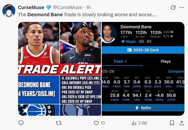 老鷹媒體狂噴貝恩:德斯蒙德-貝恩是一個十足的混蛋,他讓整個魔術團隊變得更差了,這支小丑球隊只能去競爭東部第十的附加賽席位。