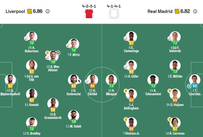 利物浦首發(fā):25-馬馬爾達(dá)什維利(6.7分)、12-布拉德利(7.2分)、5-科納特(6.7分)、4-范戴克(6.7分)、26-羅伯遜(7.2分)、38-赫拉芬貝赫(6.8分)、8-索博斯洛伊(6.9分)、10-麥卡利斯特(7.6分)、7-維爾茨(7.2分)、11-薩拉赫(7.8分)、22-?;倏耍?.4分)